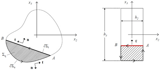 The strain flow q is a mechanical quantity of interest in engineering applications and provides a measure of the mean shear strain in the interior of the body cross-sections. To actually determine the strain flow q, we have to calculate the line integral (13). To this aim, we can exploit Green’s formulas or the divergence theorem [50]. In fact, according to the divergence theorem, the line integral of the flow of strain fields over the boundary of a two-dimensional domain coincides with the surface integral of the divergence of the same strain fields over the domain . In its turn, the divergence of is expressible in terms of divergence of the scalar fields , appearing in Equations (7)–(10). Following the procedure illustrated now, which begins from definition (13), exploitation of Equations (7)–(10), and integration based on Green’s formulas or on the divergence theorem, after some algebraic manipulation, the strain flow q can be expressed in the form