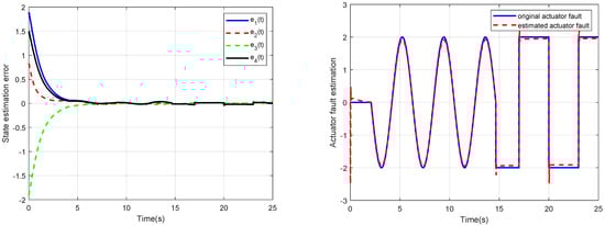 State estimation errors (left) and actuator fault and its estimated fault (right).