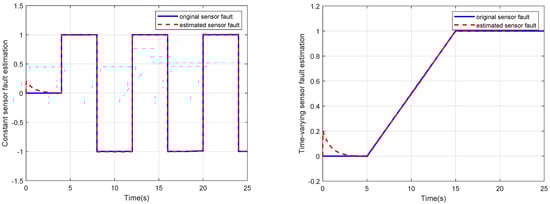 Constant sensor fault and its estimated fault (left) and time-varying sensor fault and its estimated fault (right).