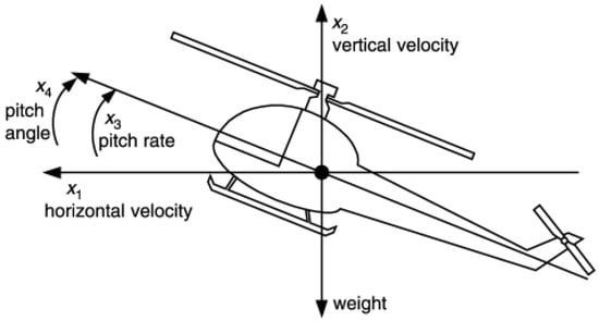 Here, the state vector is denoted as , where represents the horizontal velocity (in knots), signifies the vertical velocity (in knots), denotes the pitch rate (in degrees per second), and stands for the pitch angle (in degrees). Figure 6 illustrates the standard coordinate system for a VTOL aircraft in the vertical plane. The control input vector is represented as , where corresponds to the collective pitch control, adjusting the pitch angle (the angle of attack with respect to the air) of the main rotor blades collectively to facilitate vertical movement. Additionally, denotes the longitudinal cyclic pitch control, tilting the main rotor disc by adjusting the pitch of the main rotor blades individually to enable horizontal movement. The system matrices, incorporating the variable parameters, can be expressed as: