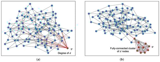 We motivate our results using a simple toy example that illustrates the effect of network topology on mining rewards. We consider a network with 99 nodes connected as a random graph of average degree 4, with each node initiating connections to two random neighbors. Let v be a 100-th node that is looking to maximize its rewards by choosing its neighbors carefully among the 99 nodes in . If a link is present between two nodes , we assume the link has a latency of one time unit. For example, the latency of links is one time unit each, while the latency between nodes a and c along the path is two time units. The block validation delay is set to 0.01 time units. The mining rate of each node u is 1/4000. At this mining rate, blocks are mined once every 40 time units on average which is roughly 10 times the broadcast delay in . In the case of Bitcoin, the time between blocks is set at 10 min, with propagation taking more than 10 seconds. While advancements have improved propagation speed, other networks with shorter block intervals, such as Dogecoin and Litecoin [51,52], also experience challenges. Network propagation delays continue to be a significant factor contributing to block forks which, in turn, impact the distribution of mining rewards [12]. Figure 1a plots the topology for where node v connects to d random neighbors with connections in red. Figure 2a shows the rewards earned by the v, as v’s degree varies from 1 to 80. Each network topology is run until 10,000 blocks are mined in the blockchain. The experiment is repeated five times per topology and averaged over five different random instances of the topology. We see that initially node v’s reward increases as the degree increases. However, once the degree reaches 30, further increase in the degree leads to a decrease in reward performance.