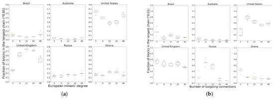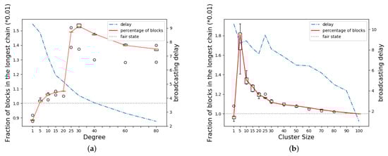 Fraction of blocks in the longest chain by v in 2 cases. Circle marks represent outliers. (a) Non-cooperative model with increasing number of neighbors; (b) Cooperative model with increasing size of v’s cluster.