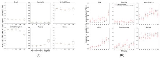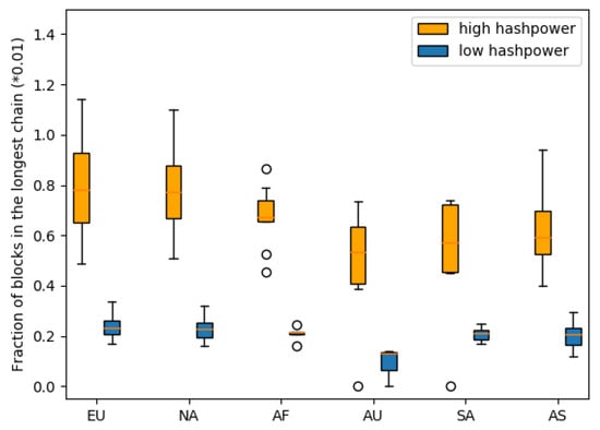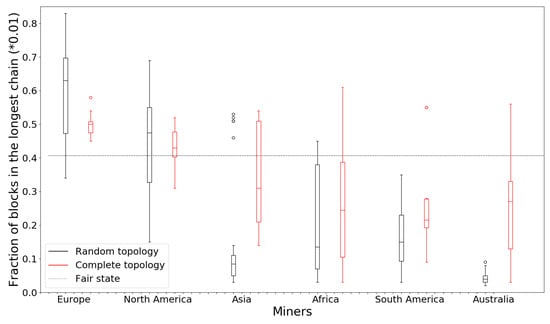 We run the experiments on some random topologies. Nodes have randomly picked hash power, and we label the top 20% of hash power nodes as the high hash power cluster in red and the bottom 20% hash power nodes as the low hash power cluster in blue. We run each topology for at least 100,000 blocks and count the valid blocks in the longest chain as their mining rewards. At each continent, we record the fractions of blocks in the longest chain mined by their high hash power nodes and low hash power nodes and plot them in boxplot in Figure 9.
