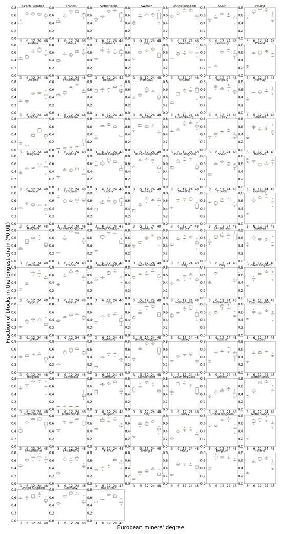 We can explain the difference between Europe, North America and the other regions as follows. As a large cluster with low link delay within the cluster, Europe and North America can receive a higher acceptance rate in their mined blocks, as it corresponds to there being a single dominant cluster in the network. Since Europe has 94 miners and North America has 83 miners, together they have 72% of all miners in the network, which provides strong fraction gains for every miner in the cluster. Figures for all the miners in Europe can be found in Figure 4.