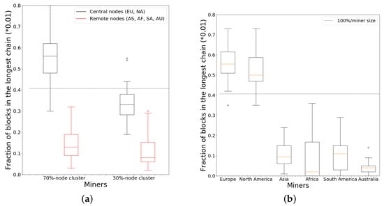 We also consider another clustering policy where we take Europe and North America together as the large cluster and the remaining continents as the small cluster. As before, within a cluster we connect each miner to all other miners in the cluster and leave only 20 connections between clusters. In Figure 6b, the fraction distributions are consistently for miners in the dominant cluster compared to Figure 6a.