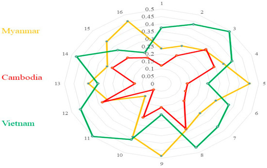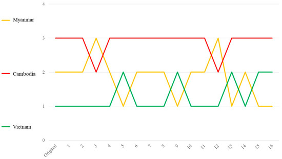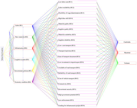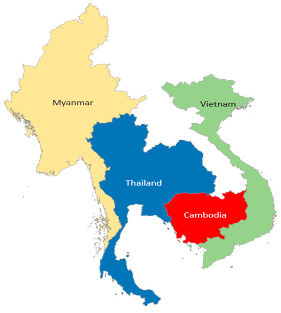 After figuring out the most important factors that affect the apparel manufacturing sector, the second step began, which was to determine the potential countries to move to or to establish that sector. According to [67], the preliminary selection was a significant procedure for selecting candidate models. It is essential to compare and evaluate the characteristics of each country, such as population size, investment climate, exchange rates, etc. In addition, interviews were conducted with senior executives from Thai and CLMV apparel companies, and site visits were undertaken in these four nations. It was discovered that investors from numerous nations, such as the United States, Canada, and Korea, expanded their garment production facilities to Myanmar, Vietnam, and Cambodia, suggesting that the labor force in those nations is qualified, skilled, and experienced in producing garments. There is a tendency to increase the minimum wage in each of the countries. However, the minimum wage in these nations was roughly two to three times less than in Thailand. In terms of market size and labor force, which is proportional to the size of each country’s population, Vietnam is the largest country in CLMV, while Lao PDR is the smallest. In addition, Myanmar is eligible to receive benefits under Japan’s Generalized System of Preference (GSP), which allow qualified products to enter preference markets, whereas Cambodia can benefit from the GSP of the United States, the European Union, and Japan. Despite the fact that Lao PDR can also benefit from the GSP, experts believe that the country’s population is too small to support a new apparel manufacturing base in the future. Consequently, our proposed model designates Myanmar, Vietnam, and Cambodia (Figure 2). The industry can leverage these advantages, including a large population, cheaper wage costs, a favorable tariff structure, and other factors, to facilitate the development of its business in the CLMV subregion.