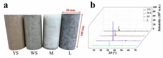 Physical specimens (a) and their XRD spectra (b).