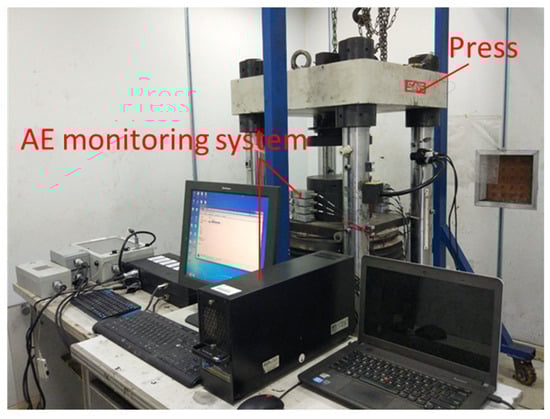 The test system consists of a press and an AE monitoring instrument. The physical object is shown in Figure 2. The press adopted the new SANS microcomputer-controlled electro-hydraulic servo pressure testing machine. The AE monitoring instrument adopted the 24-channel Micro-II type AE monitoring host of the American Physical Acoustics Corporation with a NANO-30 AE probe and a preamplifier. The loading rate of the press was set to 500 N/s. The AE acquisition parameters, including threshold, amplification, and acquisition frequency, were set to 40 dB, 40 dB, and 2 × 106/s, respectively. The AE probe was affixed to the surface of the sample by means of a special coupling agent. The instrument was connected, and the AE was calibrated. Afterwards, loading and AE acquisition were synchronized until the specimen was completely destroyed. Three replicate experiments were performed for each rock type, totaling 12 samples. The mechanical test results of all specimens are shown in Table 2.