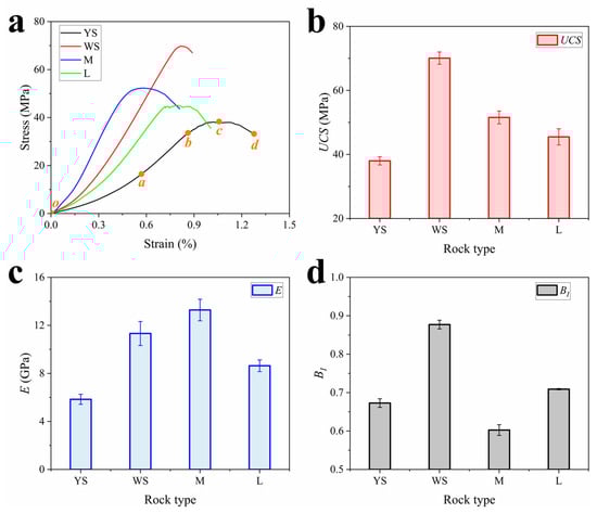 Figure 3a shows typical stress–strain curves for a set of different rocks. The curve of the yellow sandstone (YS) sample in the figure is used as an example for annotation. All samples went through four stages [21]: compaction (o-a), elastic deformation (a-b), crack propagation (b-c), and ultimate failure (c-d). The curve in the compaction stage showed an upward concave shape due to the closure of the original pores and cracks. The stress in the elastic deformation stage increased linearly with strain. After the end of elastic deformation, the crack inside the specimen developed and expanded. The damage intensified and the curve gradually became non-linear. Strain-hardening behavior was exhibited. Massive propagation and penetration of cracks within the specimen occurs when the stress is loaded to the limit of the specimen’s capacity, i.e., the uniaxial compressive strength UCS of the specimen. This leads to a reduction in the load-carrying capacity of the specimen, which is shown in the stress–strain curve by an increase in strain and a gradual fall in stress.