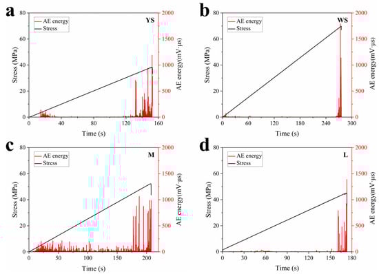 AE energy variations characteristics: (a) yellow sandstone; (b) white sandstone; (c) marble; (d) limestone.