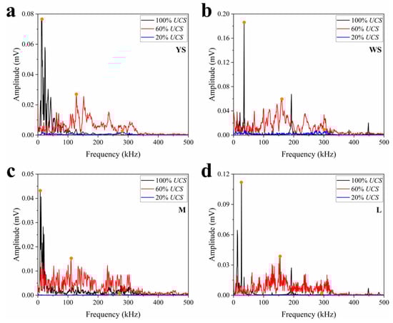 The frequency domain characteristics of AE were investigated by time-frequency transforming the AE hits at different stress level points (including at 20%, 60%, and 100% of the peak stress) during the loading process. The classical fast Fourier transform (FFT) method was used for the time-frequency transformation, and the spectrum obtained after the transformation is shown in Figure 5. The maximum amplitude of the AE signal and the corresponding frequency (i.e., the dominant frequency) were mainly explored. The dominant frequencies and dominant amplitudes for different rocks are summarized in Figure 6. In general, the amplitude of the AE signal gradually increased with increasing stress, while the frequency gradually decreased [23]. In terms of frequency specifically, the main frequency of the acoustic emission signal was above 250 KHz at the beginning of loading, while at the peak stress moments, the frequencies of the signals were all below 40 KHz. This is related to the scale of the crack, that is, the size of the crack. In the early stages of rock loading, the scale of the crack within the rock is small and tends to be a grain-wide fracture. Later in the loading period, a large number of cracks propagate and penetrate, and macroscopic cracks visible to the naked eye will appear. In general, large-scale cracks correspond to low-frequency, high-amplitude signals, while the opposite is true for small-scale cracks [23]. The evolution of AE signals during the loading process of all rocks has a basically similar law, i.e., it evolves from high-frequency, low-energy signals to low-frequency, high-energy signals with the increase of the fracture scale. The dominant frequency of the AE and its amplitude were correlated with the brittleness of the material when comparing different rocks. Specifically, the more brittle the rock, the higher the dominant frequency and the higher the amplitude of the signal, regardless of the stress level. White sandstone was the most brittle, and it had the highest dominant frequency and amplitude. Marble was the least brittle and had the lowest dominant frequency and amplitude.
