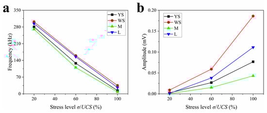 (a) AE dominant frequency and (b) dominant frequency amplitude for different stress levels.