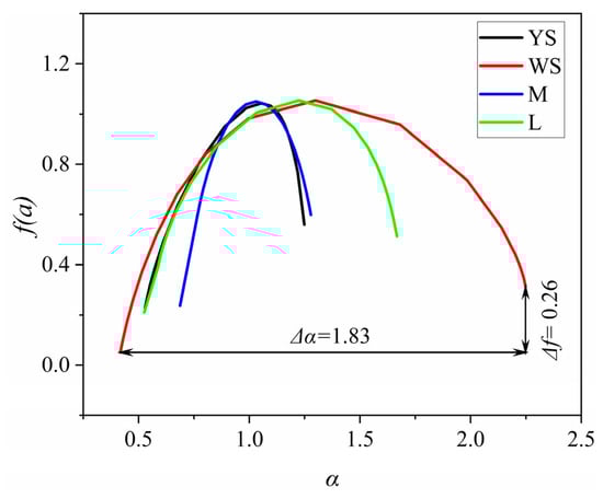 In order to further reveal the AE characteristics of different brittle rocks, multi-fractal theory was introduced to deconstruct and analyze the AE energy data sequence. According to Hu et al. [20], the multi-fractal map α–f (α) can reflect the uneven distribution characteristics of the data. The width of the spectrum Δα (Δα = αmax − αmin) reflects the uniformity of the data distribution. The larger the width of the spectrum, the more diverse the data and the more pronounced the multi-fractal characteristics. The ∆f value (∆f = f (αmax) − f (αmin)) of the spectrum reflects the relationship between the occurrence frequency of big data and small data. A smaller value of ∆f means that big data occurs more frequently, and a larger value means that small data occurs more frequently. Moreover, ∆f > 0 indicates that small data is dominant; ∆f < 0 indicates that big data is dominant. It should be noted that big data refers to higher AE energy values, which usually imply large-scale rock fracturing events, while small data refers to lower AE energy values, which often imply small-scale rock fracturing events.