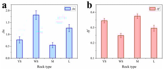 Multi-fractal parameters for different rocks: (a) ∆a; (b) ∆f.