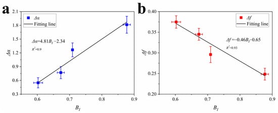 Relationship between brittleness index and multi-fractal parameters: (a) ∆a; (b) ∆f.