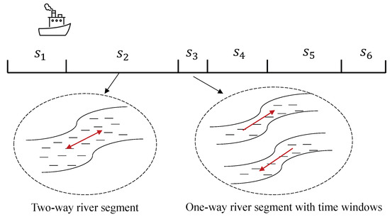 Based on the type of rivers (e.g., the mainstream and tributaries) and the restriction of the sailing speed, the sailing route of inland water transportation can be divided into many sailing segments as shown in Figure 1. We use I to denote sailing segments, and refers to a particular sailing segment. For example, there are six sailing segments in Figure 1. We use to denote the length of the sailing segment i. Most of the sailing segments are wide enough to allow for two-way sailing, i.e., vessels can travel in both directions in this channel at the same time. Some of the sailing segments are so narrow that vessels can only pass in one direction at a time, e.g., the third sailing segment in Figure 1. Therefore, there is a fixed time window for this sailing segment. For example, vessels can travel from upstream to downstream from 00:00 to 11:00 and can travel from downstream to upstream from 15:00 to 20:00. Note that there is a 4 h gap between sailing direction changes, which is the time set aside to clear the vessel from the previous time period. We use and to denote the set of one-way sailing segments and the set of two-way sailing segments, respectively. And we have . The sailing speed for each sailing segment i is , which is a decision variable. For the one-way sailing segment , the sailing speed is within a maximum limit of and a minimum limit of , that is, , . For the two-way sailing segment , the sailing speed only has a maximum limit of , that is, , .
