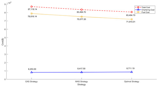 Through comparison, we have observed that our research model demonstrates the capacity to effectively integrate various factors such as segment distances, time windows, and velocity constraints. It enables the optimal determination of sailing speeds and time windows for each segment, thereby ensuring timely arrival at the port of discharge while minimizing the overall costs to the greatest extent possible. This aptly showcases the efficacy of our model, as it adeptly combines these elements to achieve optimal outcomes. The costs under three different strategies are displayed in Figure 2.