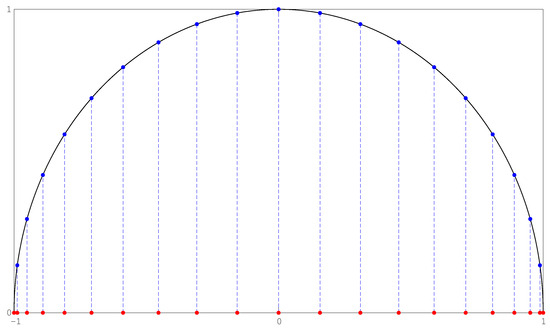 Although standard polynomial interpolation methods usually employ equally spaced points, Chebyshev interpolation, rather than equally spaced points along a line, instead uses the roots of Chebyshev polynomials, known as Chebyshev nodes, corresponding to equally spaced points along the unit semicircle (see Figure 1). It is well known (e.g., [16]) that Chebyshev nodes tend to minimize certain interpolation errors and are thus preferred over equidistant nodes, which may suffer from the so-called Runge phenomenon [17,18], manifested as large oscillations near the endpoints of the interpolation interval. Furthermore, Chebyshev polynomials are known to provide the best, in the -norm sense, polynomial approximation to a function [19].