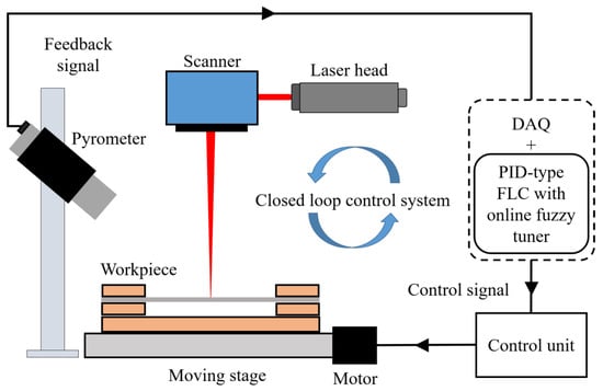 As shown in Figure 1, the temperature at the cutting front on the workpiece was measured using a pyrometer (IMPAC IN 210, LumaSense Technologies Inc., Ballerup, Denmark). A data acquisition module (DAQ USB-4711A, Advantech Co., Ltd., Taipei, Taiwan) was used to record the output data from the pyrometer. The data acquisition module contained a LabVIEW platform that included the developed PID-type FLC with an online fuzzy tuner and generated the control signal to the moving stage controller for the cutting speed adjustment.