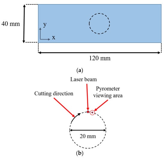 Schematic diagram of (a) specimen size and (b) laser cutting of a circular path.