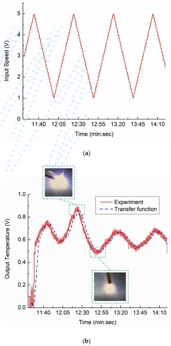In order to optimize the functionality of the PID-type FLC, a mathematical model of the laser cutting process was developed. The procedure of determining the relevant parameters, in a calculation of the required transfer function of the laser cutting system, includes generating different speeds of the moving stage (Figure 3a) and recording the cutting front temperature (Figure 3b) in terms of voltage in a single run. The process of parameter identification requires persistent excitation in which the input is large enough to excite all the identifier modes. Since a triangular wave of 0.02 Hz is composed of a series of sine and cosine waves with various frequencies, it was used as the system input of the speed to satisfy the condition of persistent excitation [], as shown in Figure 3a. Note that, in the identification procedure, the input speed and the output temperature were recorded simultaneously by DAQ. The lower and upper values of the input speed were set as 1 V and 5 V, respectively. The recorded data were then used as an input of the MATLAB identification toolbox. As shown in Figure 3b, the waveforms of the experiment and the transfer function were generally in good agreement. As a consequence, the transfer function was acquired using the MATLAB® code (The MathWorks Inc., Natick, MA, USA), and is given below,