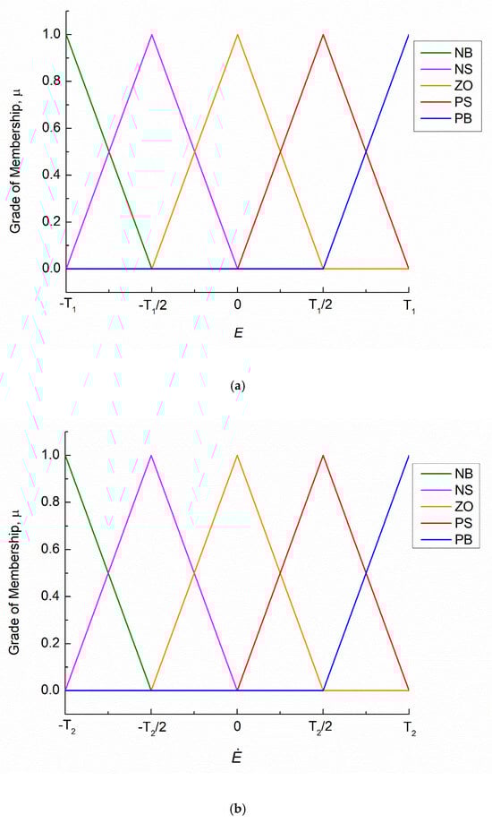 where γinitial represents the initial value of γ and Δγ denotes the tuned value derived from the fuzzy tuning mechanism, falling within the range from −T5 to T5. A small value is chosen for Δγ when the error is very large, and vice versa. γ was found as a non-negative value by applying the fuzzy rules in Table 2. As a result, the control performance was enhanced.