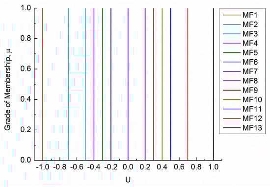 Figure 4 shows the PID-type FLC with two output scaling factors, namely α and β. Additionally, its input membership functions were also adjustable through two parameters (T1 and T2), as shown in Figure 5 []. The membership functions for scaled error E and scaled derivative of error were triangular functions. Five linguistic levels were assigned to the fuzzy sets for E and such as negative big (NB), negative small (NS), zero (ZO), positive small (PS), and positive big (PB). Thirteen singleton membership functions were used for the output variable U of FLC, as shown in Figure 6 []. The fuzzy rules for the computation of U were shown in our previous study []. In general, the fuzzy rules of FLC used in Ref. [] were adopted, but the values of α, β, T1, and T2 were reconfigured to achieve the optimal performance in the laser cutting of thin non-oriented electrical steel sheets. To avoid changes in the ambient environment, the system needs to be tuned in an online manner to obtain the optimal control performance. It is feasible to choose an appropriate value for β to obtain a fast system response while avoiding instability []. To implement this idea, a fuzzy tuning mechanism was introduced to tune the gain β in a way similar to that in Ref. []. In the fuzzy tuner, three parameters (T3, T4, and T5) were re-designed to optimize the performance of the tuning mechanism, as shown in Figure 7.