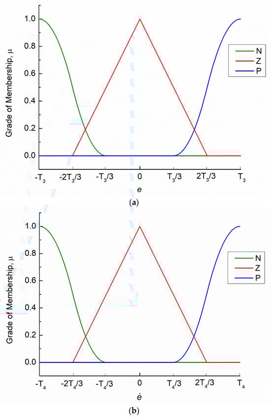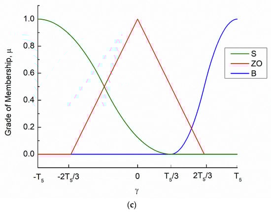 As shown in Figure 7, the utilization of s-shaped, z-shaped, and triangular membership functions for both the error e and its derivative is depicted, which are adjustable through two parameters T3 and T4, respectively, and for the output γ within the range from −T5 to T5. Negative (N), zero (Z), and positive (P) linguistic levels were assigned to the fuzzy sets for the input variables (e and ). For the output variables γ, there were three linguistic levels, namely small (S), zero (ZO), and big (B). In practical applications, a fuzzy system’s performance is greatly influenced by membership functions. To achieve a desired response, initially, rectilinear membership functions (e.g., trapezoidal and triangular) were used, and subsequently, they were substituted with curvilinear ones (e.g., s-shaped and z-shaped) in the fuzzy tuner.