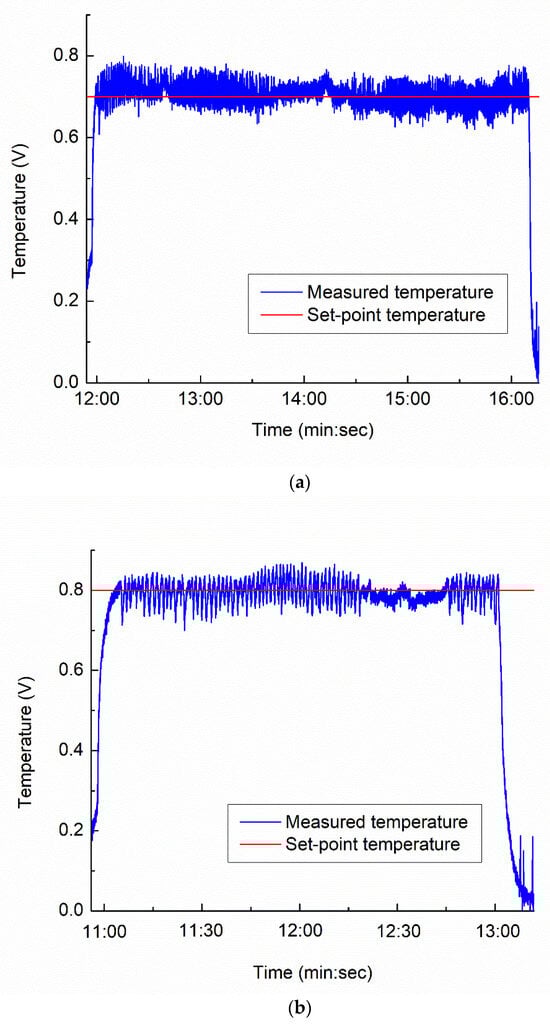 Measured temperature for (a) closed-loop control with a set-point temperature of 0.7 V, (b) closed-loop control with a set-point temperature of 0.8 V, and (c) open-loop control with a constant cutting speed of 0.5 mm/s at a laser pulse frequency of 20 kHz.
