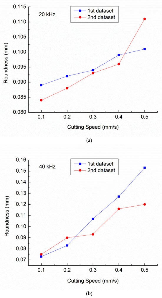 Variation in roundness with cutting speed under open-loop control at pulse frequencies (a) 20 kHz and (b) 40 kHz.