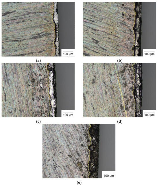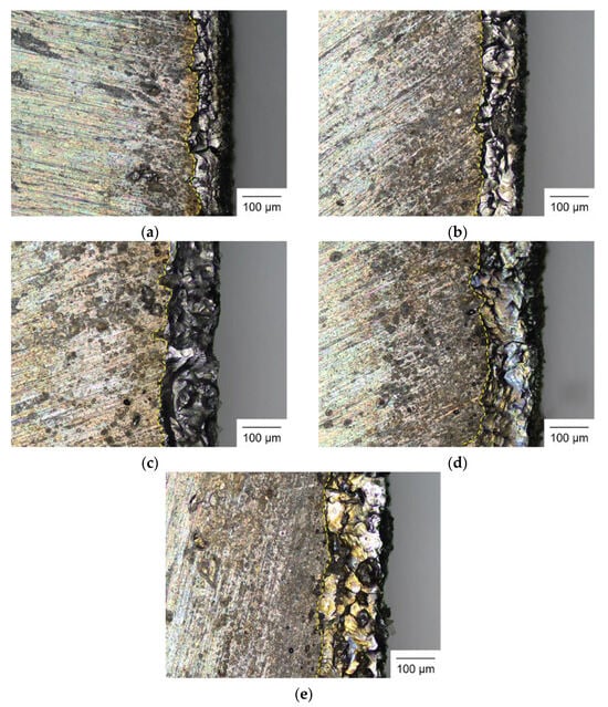 Optical micrographs of HAZ under open-loop control with a constant cutting speed at 40 kHz: (a) 0.1 mm/s; (b) 0.2 mm/s; (c) 0.3 mm/s; (d) 0.4 mm/s; and (e) 0.5 mm/s.