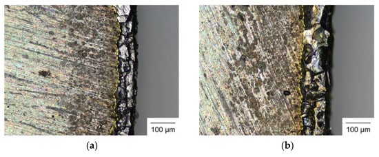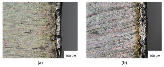 Representative optical micrographs of HAZ under closed-loop control with adjusted cutting speed at 40 kHz: (a) 0.7 V; and (b) 0.8 V.