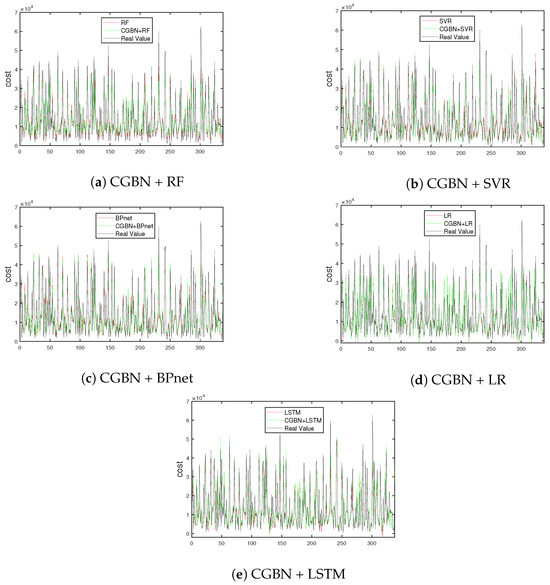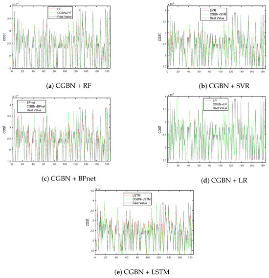 The three classes of CGBN structure learning algorithm were first used to learn dataset A. Then, the multiple network structures learned from the CGBN network structure algorithm were analyzed to obtain isolated nodes. After analysis, there was one isolated node with the highest number of occurrences in multiple network structures. The results obtained by the hybrid algorithms after deleting the isolated node corresponding to the feature variables in dataset A are shown in Figure 3. The single models (e.g. RF, SVR, etc.) analyzed the original dataset with no reduction in feature variables. Figure 3 shows the prediction graphs for CGBN + RF, CGBN + SVR, CGBN + BPnet, CGBN + LR, and CGBN + LSTM. Each graph contains the results predicted by the hybrid model, the results predicted by the single model, and the true values in Figure 3. As can be seen from Figure 3, the trend of the prediction curves of the hybrid and single models in Figure 3a,c are very close to the trend of the true curves, which indicates that CGBN + RF, RF, CGBN + BPnet, and BPnet have a better prediction ability on dataset A. The prediction curve of CGBN + LR in Figure 3d almost overlaps with the prediction curve of LR, which indicates that the prediction ability of CGBN + LR is the same as that of LR in the case of reduced data. Moreover, Figure 3b,e exhibit better predictive power than Figure 3d. Overall, the prediction curves of the hybrid models with reduced data volume are similar to those of the single models, which reflects the reasonableness of the hybrid models.