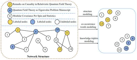 With the popularity of Internet applications such as social networks, e-commerce platforms, online news, and search engines, various types of data (e.g., text, images, audio, etc.) are constantly emerging, and people need to extract useful features from these data to help decision-making. In networks, nodes usually represent entities (e.g., people, objects, events, etc.), and the connecting edges between nodes represent relationships between entities. For network data such as social networks, knowledge graphs, etc., node’s text features and network structure features contain rich entity attributes and relationship features between entities, while the connected edges between nodes represent association relationships between entities. Therefore, it has become a hot research direction on how to use node’s text features and network structure features for network representation learning [,,,,] in the field of machine learning, whose main goal is to map the nodes and network structures into a low-dimensional embedding space to facilitate learning and reasoning for various downstream tasks. Currently, network representation learning has become an important part of several fields, such as graph embedding and knowledge graph representation learning. In terms of development history, network representation learning is mainly divided into two stages: matrix factorization-based methods and deep learning-based methods. Early network representation learning methods are mainly based on matrix factorization, i.e., these methods are based on singular value factorization, and these methods are based on probability matrix factorization. Although these methods can learn the low-dimensional representation vectors of nodes, they are usually unable to handle nonlinear relationships in the network well because of the limitations of higher sparsity and lower semantics inherent in matrix factorization. In particular, the higher sparsity of data can bring higher computational complexity and poorer parallelism to traditional machine learning algorithms, which has become a limitation to the use of statistical learning methods for solving the different network data mining tasks. With the use of deep learning (neural networks), network representation learning methods based on deep learning have begun to receive attention from researchers. Deep neural networks have become the mainstream methods in network representation learning, which mainly include methods based on self-encoder [], methods based on convolutional neural networks, and methods based on recurrent neural networks []. On the other hand, there are also some methods based on Graph Convolutional Networks (GCNs) [], whose main idea is to aggregate the feature of each node with features of its neighboring nodes through convolutional operations, learning the low-dimensional embedding vectors of the nodes.