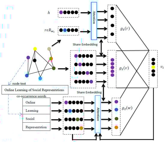 where denotes the learning rate. After obtaining the updated forms of and θ, the objective function can be optimized iteratively. The weights need to be multiplied into Equation (14) before to balance the network structure model and the text feature model. denotes the sum of word representation vectors, and represents the representation vector of words. The attention function is used to balance the contribution rate of different co-occurrence words to the model.
