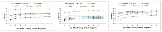 As shown in Figure 3, the span of network node classification accuracy values of the five comparative algorithms on the Citeseer and DBLP datasets is greater than their values on the SDBLP dataset. On the SDBLP dataset, the network node classification accuracies of the five comparison algorithms show a significant upward trend. However, on the Citeseer and DBLP datasets, the accuracy curves show a relatively slow upward trend. The main reason for this phenomenon is that on sparse networks, there is a large variability in the features acquired between different algorithms. If a certain algorithm can acquire features that more fully reflect the network structure, its network classification performance becomes better. On such sparse networks, the network representation learning algorithms based on joint learning can compensate for the insufficient training problem due to the sparsity of the network. Regarding dense networks, different algorithms can obtain effective network structure features from sufficiently connected edges, and thus, the differences in classification performance are smaller.