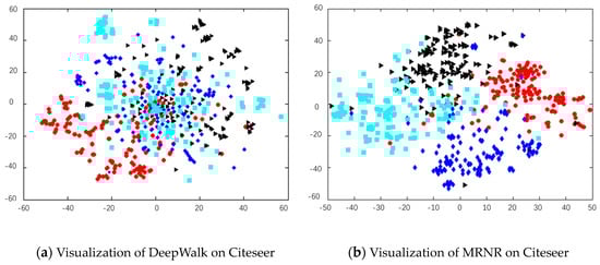 The main purpose of network representation visualization is to examine whether the trained representation vectors exhibit a significant clustering phenomenon, which can be considered whether the network representation has learned the community features of the network. If the community division based on network representations is more accurate, it has better reliability in network node classification tasks. This paper randomly selects four classes of nodes from the Citeseer dataset and 150 nodes from each class. At the same time, we use the t-SNE algorithm to degrade and visualize the network representation vectors. The specific results are shown in Figure 4.