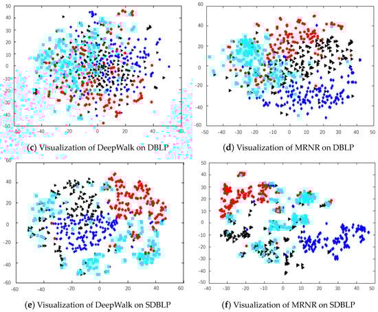 Visualization results of the 3 datasets on DeepWalk and MRNR (Different colors represent different labels of nodes).