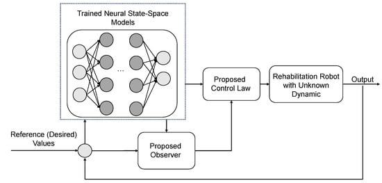 Schematic representation of the proposed model-free neural state-space controller for rehabilitation robots, integrating a trained neural state-space model with a proposed observer and control law to drive the robot with unknown dynamics towards desired reference values.
