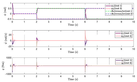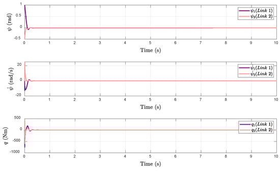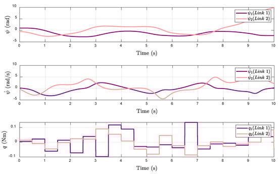To further gauge the efficacy of our proposed controller, we conducted an auxiliary test by altering the initial state values of the system. We present the system’s time history and control input when the ignition velocities of the robot links deviate from zero, differing from the previous example. The chosen initial states for this test are .