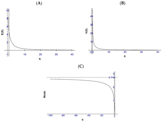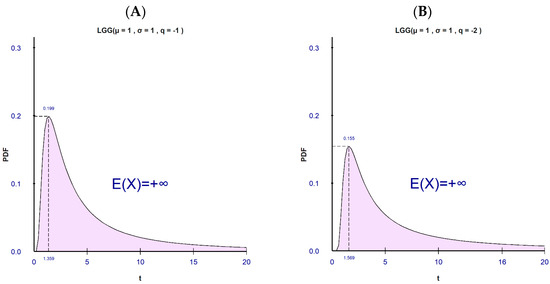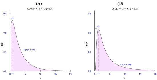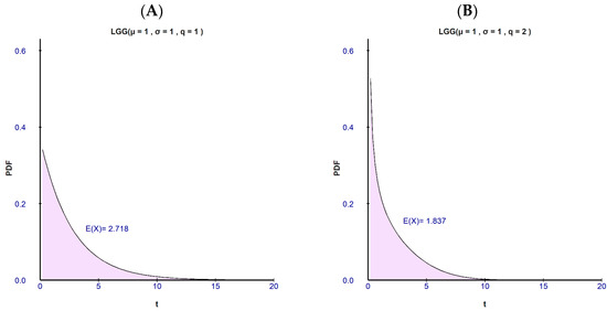 The generalized gamma distribution was introduced by [13] and consists of eliminating the location parameter defined by [42] while keeping the two shape parameters and the scale parameter. Three years later, ref. [14] advanced the methodology for estimating the parameters of the generalized gamma. Later, ref. [15] suggested the GLG, which consists of reparameterization and an extension of the result proposed by Stacy [13,14]. In fact, GLG allows negative values for the shape parameter q, proving to be more flexible than Stacy’s proposal. The main advantage of Prentice’s contribution is the ease of estimation using the maximum likelihood method.