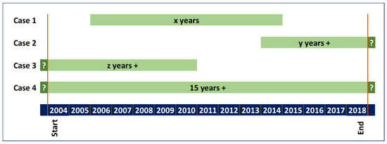 The estimation process only starts after determining the values of the variable , which represents the number of activity years for the company in the period 2004–2018. In Case 1 of Figure 5, represents the total lifetime of a ceased enterprise during the analyzed period. In Case 2, the variable may be considered the age of the company in 2018, that is, at the end of the period. In Cases 3 and 4, is a minorant to companies’ life expectancy. Hence,