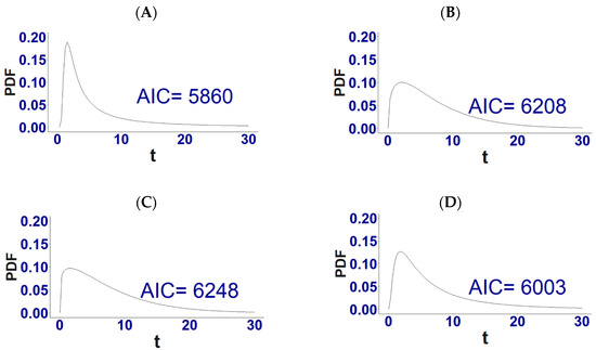 As shown in Figure 6, the value of the Akaike Information Criterion (AIC) [52] is presented in each graphical representation. This criterion allows us to compare the model’s quality in terms of goodness of fit, and the associated coefficient is defined as