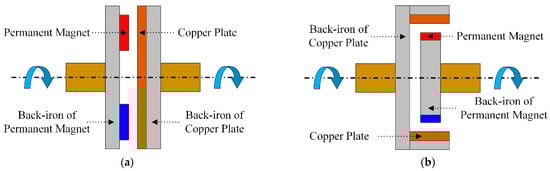 APMCs can be roughly divided into axial and radial types, as shown in Figure 1, according to the excitation directions of the PMs []. From the perspective of practical applications, an axial configuration is selected in this paper due to the smaller axial space required between the motor and the load and higher axial alignment tolerance, and the difficulty of aligning the PM rotor and conductor can be reduced. Axially magnetized PMs are arranged alternately on the back-iron and connected to the load. Each pair of magnetic poles produces the same electromagnetic characteristics and mechanical performance. The primary side is connected to the prime mover using a copper back-iron structure with high conductivity and permeability []. It is evident that this connection mode enables absolute mechanical isolation between the prime mover and the load. Once the load is exceeded during operation, the active and passive shafts will automatically decouple, which can be restored after relieving the load, without any damage to the device. Therefore, based on its self-protection mechanism, the APMC is particularly suitable for transmission linkages in high-pressure systems, absolutely sealed systems (e.g., hazardous, corrosive, high cleanliness, etc.), and high-vacuum systems. Electromagnetic torque is generated by the interaction between the reaction field of the induced current and the permanent magnetic field, which are excited by the copper and PMs, respectively [].