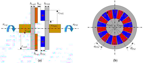 In Equation (14), σcop, s, and ncop are the conductivity, slip, and rotational speed of the copper rotor, respectively. Cav and Sav correspond to the perimeter and area at the average radius of the sector-shaped PM.