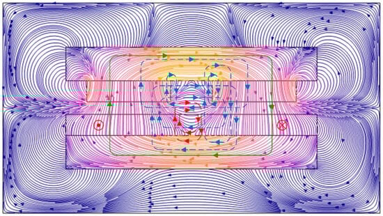 The 2D finite element qualitative simulation results for the APMC are presented in Figure 3 to intuitively visualize the magnetic flux distribution and rationally plan the magnetic circuit. As shown in Figure 3, the APMC exhibits a typical axisymmetric structure, so only the magnetic flux paths under the pair of poles need to be planned: the main magnetic circuit (solid green line) passes through the copper rotor back-iron, copper rotor, air gap, PM rotor, and PM back-iron, forming a closed loop. The magnetic flux paths consisting of the adjacent PMs, PM, and its back-iron and the copper rotor and its back-iron are all leakage magnetic flux paths (dashed blue line). In particular, the induced eddy current within the copper rotor is indicated in Figure 3 with red dots and cross symbols. The magnetic flux paths generated by the eddy current effect are represented by the long dashed red line, which passes through the conductor region and forms a closed magnetic circuit within the air gap and back-iron. The magnitude of the eddy current reaction varies with slip. In the case of high slip, the proportion of magnetic flux generated by the eddy currents is significant to the total leakage magnetic flux [,].