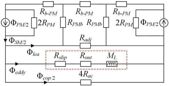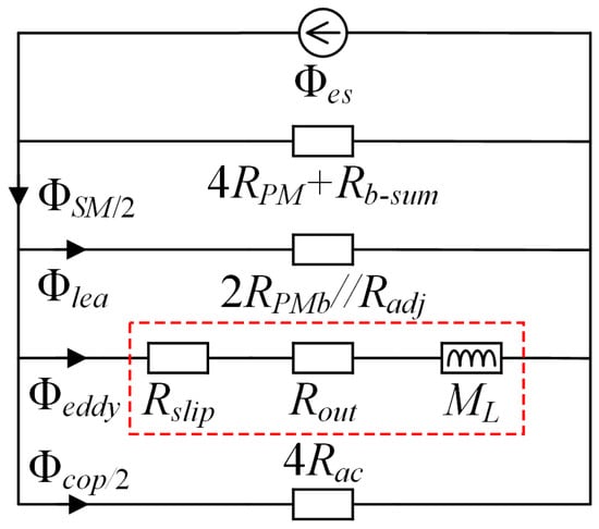 Based on the symmetrical structure of the APMC and the magnetic circuit analysis, an initial EMC model for a half-pole pair shown in Figure 4 is established, where the red dashed line represents the branch magnetic circuit of the eddy current effect. The expressions for PM magnetic flux ΦPM and magnetic resistance RPM can be derived. The eddy current circuit contains two parts of magnetic resistance corresponding to the output power (defined as Rout) and slip power (defined as Rslip), as well as the magnetic inductance ML corresponding to the changing magnetic field.