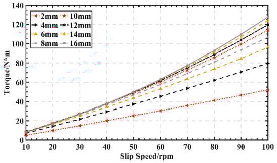 Figure 10 makes an arithmetic progression with 2 mm to 16 mm as the interval and 2 mm as the common difference to study the torque variation under different conductor plate thicknesses. In general, the torque increases significantly when increasing the slip speed and conductor plate thickness. At low slip, the effective magnetic field in the air gap mainly comes from the permanent magnetic field of the PMs, and the increase in the conductor plate thickness leads to an increase in the leakage magnetic flux, which reduces the effective magnetic field in the air gap. As the slip increases gradually, the induced magnetic field excited by eddy currents and the effective magnetic field in the air gap increase with the increase in the conductor plate thickness, manifested as the increase in torque. However, when the conductor plate thickness increases to a certain value, the growth rate of torque decreases at the same slip speed. Therefore, the relationship between the conductor plate thickness and the device volume cost should be considered comprehensively in the design and optimization of the APMC, so as to obtain the optimal matching scheme.