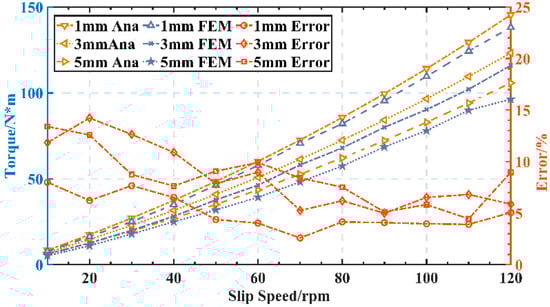 As mentioned above, the APMC realizes torque regulation by changing the thickness of the air gap between the conductor and PMs, which in turn regulates the output speed of the device, i.e., it is used as a governor. Figure 11 shows the analytical and finite element calculation results of the torque and errors at different slip speeds with air gap thicknesses of 1 mm, 3 mm, and 5 mm, respectively. It can be seen that the error between the analytical and finite element results is larger when the air gap thickness is 1 mm at low slip speeds. The reason is that when the air gap thickness and slip speed are both very small, the main magnetic circuit will experience relatively severe distortion, which makes the difference between the two calculation results larger. Therefore, in order to ensure a stable output performance in practical applications, the air gap thickness is generally controlled to be around 3 mm without being too small.