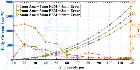 The results of the analytical and finite element calculations of the eddy current losses under different air gap thicknesses and the error between the two methods corresponding to Figure 11 are shown in Figure 12. The error is larger for an air gap thickness of 5 mm at low slip speed. The reason for this situation is that the eddy current mainly generates losses in the form of heat. When the air gap thickness is relatively large, the magnetic resistance of the air gap and the energy consumption increase, which ultimately leads to the deviation of the calculation results. Other than that, the errors of the analytical and finite element calculation results fluctuate within an acceptable small range, proving that the model proposed in this paper can calculate the eddy current losses accurately.